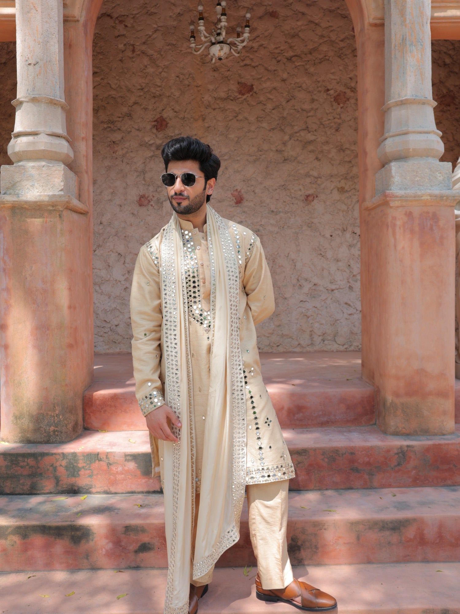 Shine bright in this golden mirror work kurta, where intricate mirror detailing meets luxurious craftsmanship. Designed for festive celebrations and weddings, it combines traditional artistry with contemporary style, making every occasion a statement of elegance and charm.