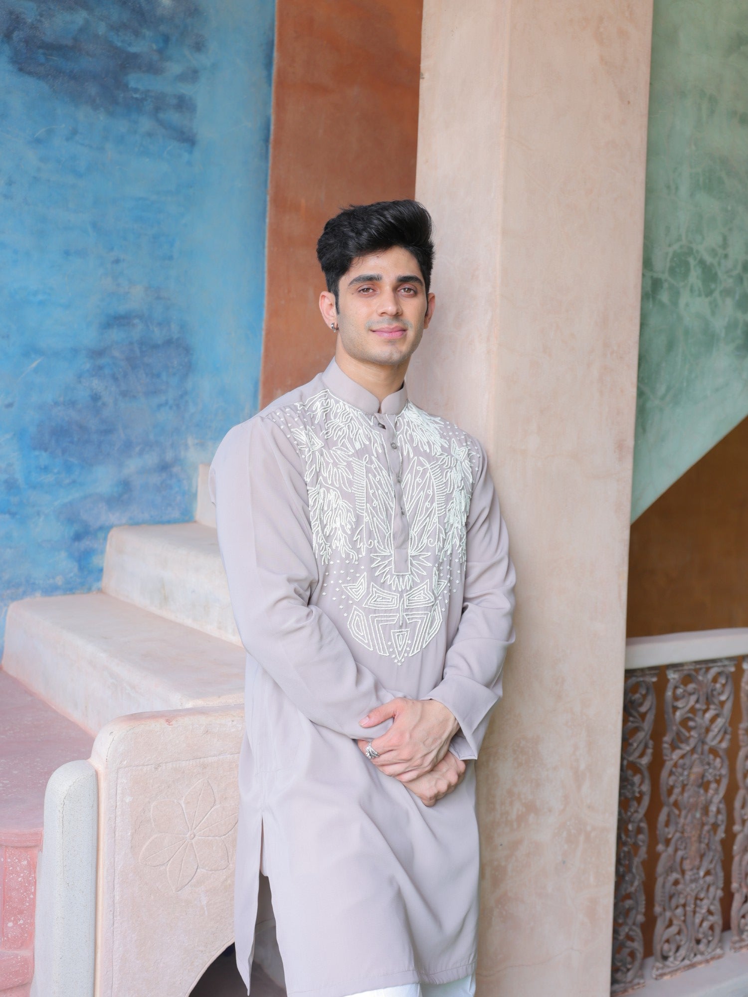 Step out in effortless elegance with this beige kurta, adorned with medium white embroidery for a refined, festive charm. Perfect for celebrations and day events, paired with off-white pants for a polished look.