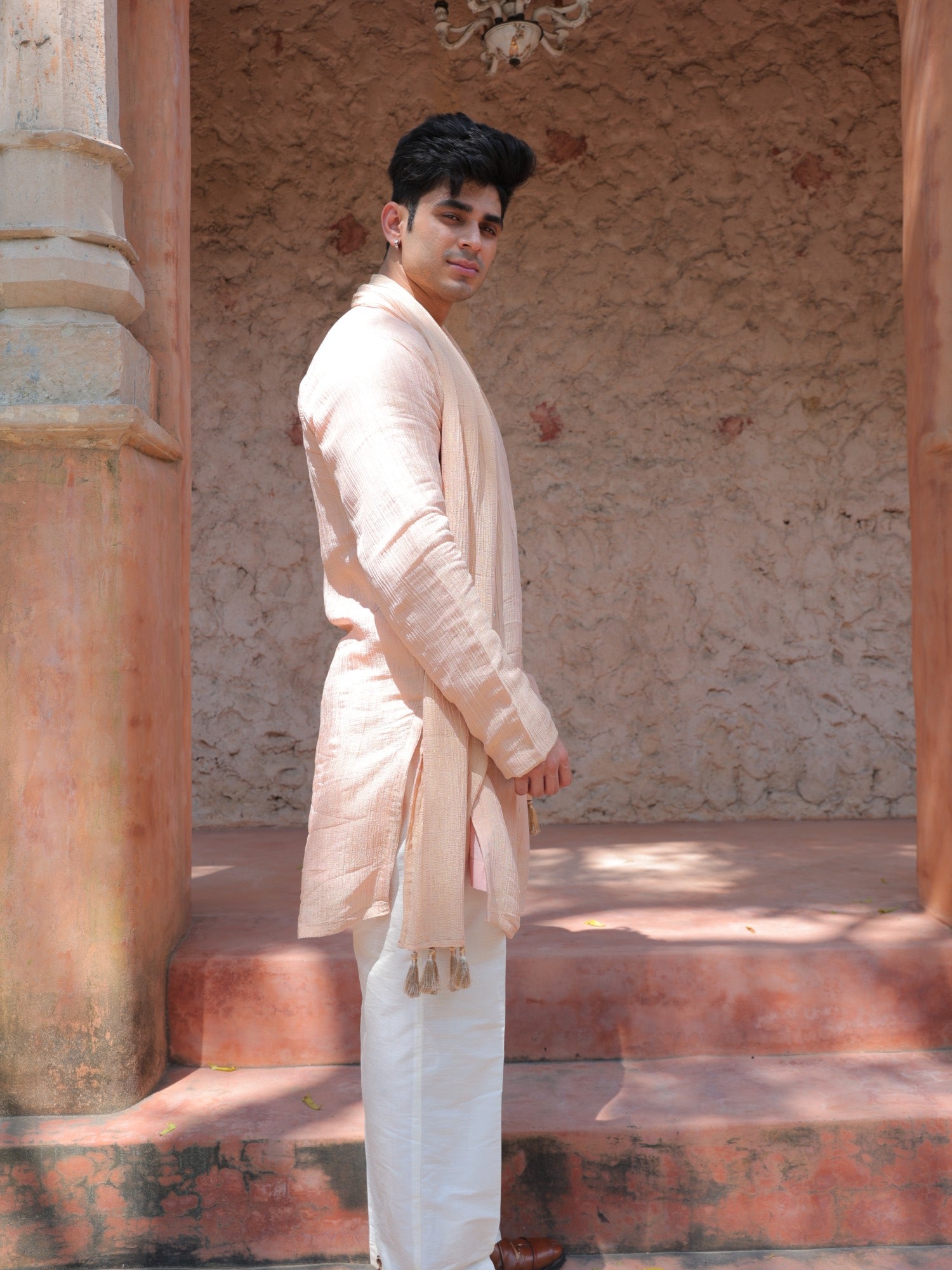 Step into festive elegance with the Peach Mirror Work Kurta Set. This kurta features delicate mirror detailing on soft peach tissue fabric, adding a subtle shimmer with every movement. Paired with crisp off-white pants, the ensemble strikes the perfect balance between sophistication and celebration. Designed for comfort and style, it’s ideal for weddings, festive gatherings, or any special occasion where understated luxury meets contemporary charm.